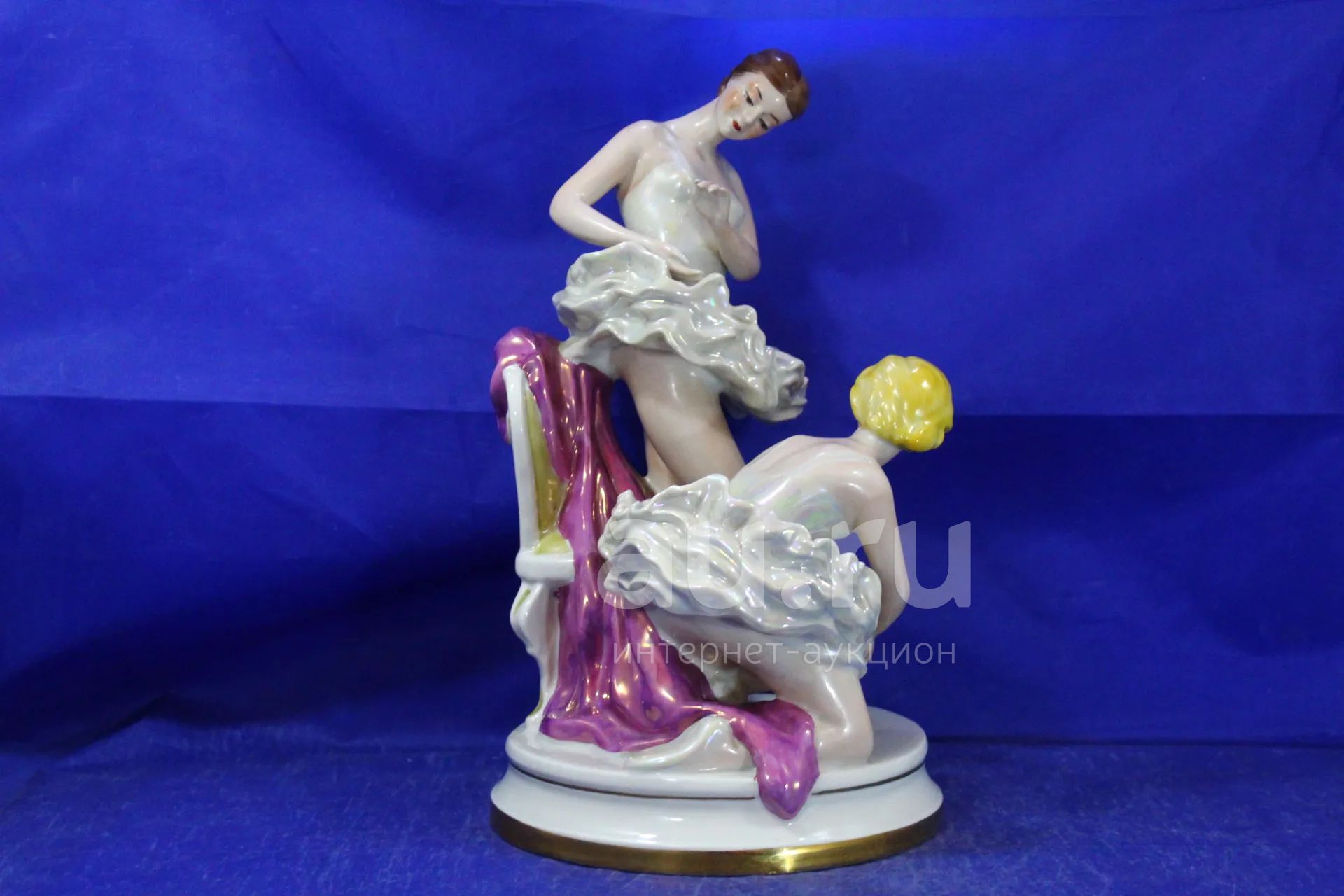 Фарфоровая статуэтка Балерины перед выступлением две девушки помогают друг другу одеться Киевский завод художественного фарфора, 1960-е годы, автор О. Л. Жникруп. Высота 30 см, ширина 14 см. Две молодые танцовщицы изображены в закулисный миг: одна, опершись на стул, готовится к выходу на сцену, вторая склонилась, поправляя ей пуанты. Скульптору удалось соединить в фарфоре хрупкость и силу, передать естественность движений и точность пропорций человеческого тела в динамике. В мягких линиях и наклоне фигур звучит доверие, внимание и дружеская поддержка, а лёгкость балетных пачек придаёт композиции воздушность. Работа дышит гармонией и поэтической красотой, превращая бытовой момент в олицетворение искусства. Подлинность подтверждается заводским клеймом, сохранность отличная. Подобные крупные композиции Жникрупа встречаются крайне редко и относятся к музейному уровню, высоко ценятся коллекционерами. Это не только яркий акцент для интерьера, но и надёжное вложение в антиквариат, чья художественная и инвестиционная ценность неуклонно растёт, отличный не дорогой со вкусом оригинальный подарок, да и себе можно и нужно купить
